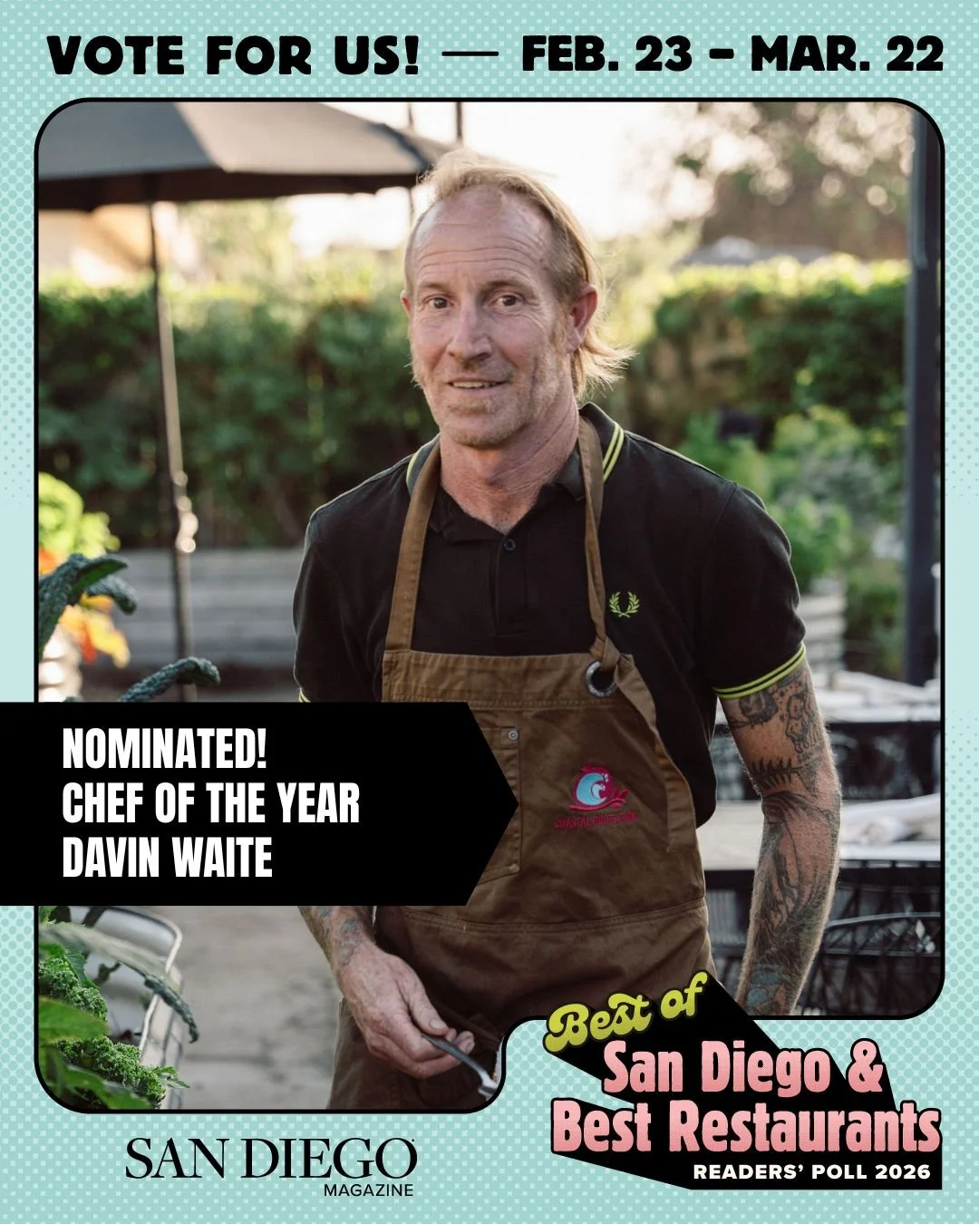 We are so thrilled to announce that Chef @davinwaite has been nominated as Chef of the Year for San Diego Magazine’s Best of 2026.